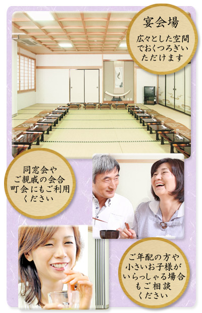 同窓会やご親戚の会合には、旅館ならではの 広々としたゆったりした宴会場で 新鮮な魚の幸と季節のお料理に舌鼓を 打ちながら、時間を忘れてお愉しみいただけます。 お食事はご年齢や会合にあわせてお作りいたします お気軽にご相談ください ご年配の方やお子様がいらっしゃる場合は 個別で対応承ります、ご相談ください。